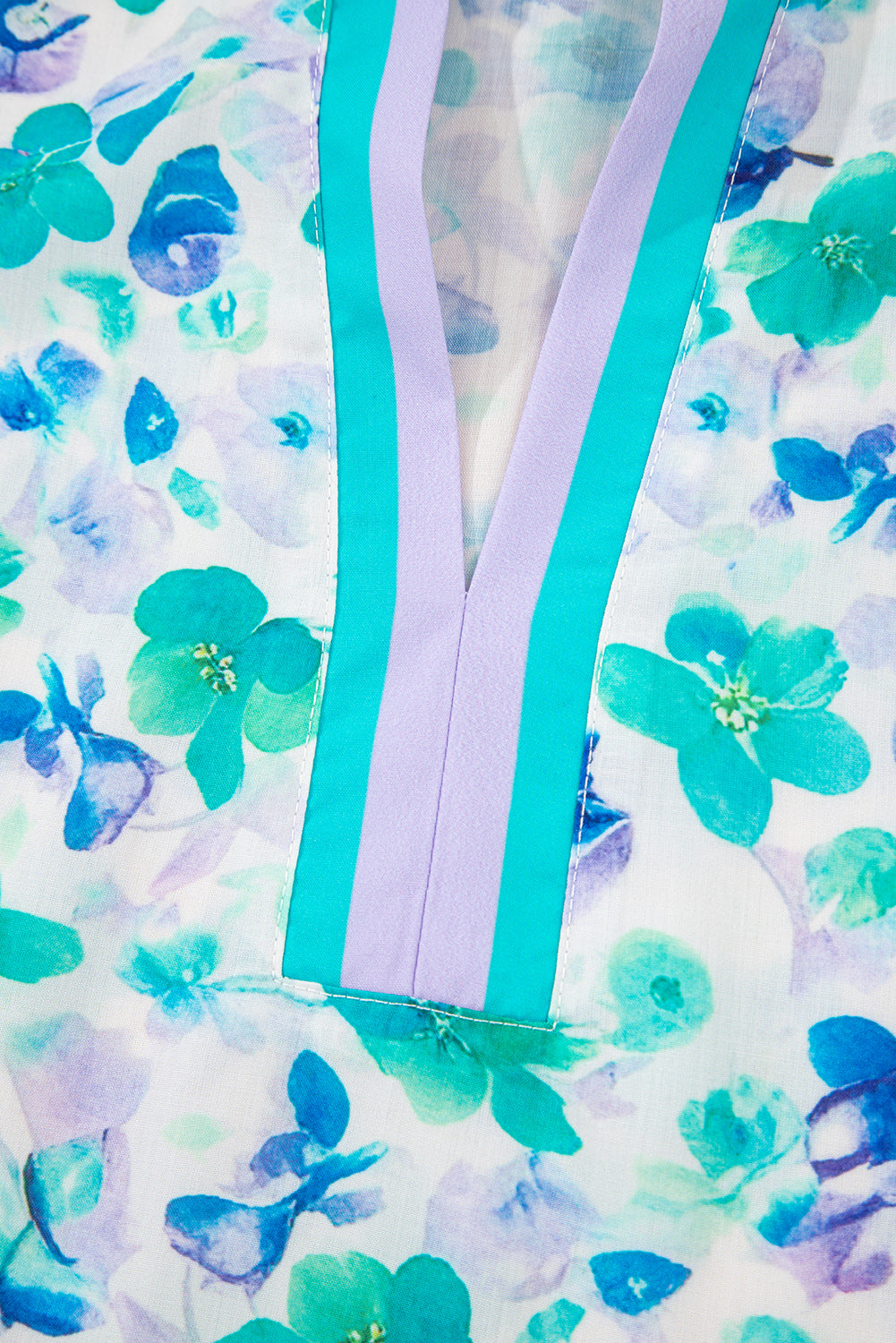 Green Floral Print Striped Trim Split V Neck Puff Short Sleeve Blouse