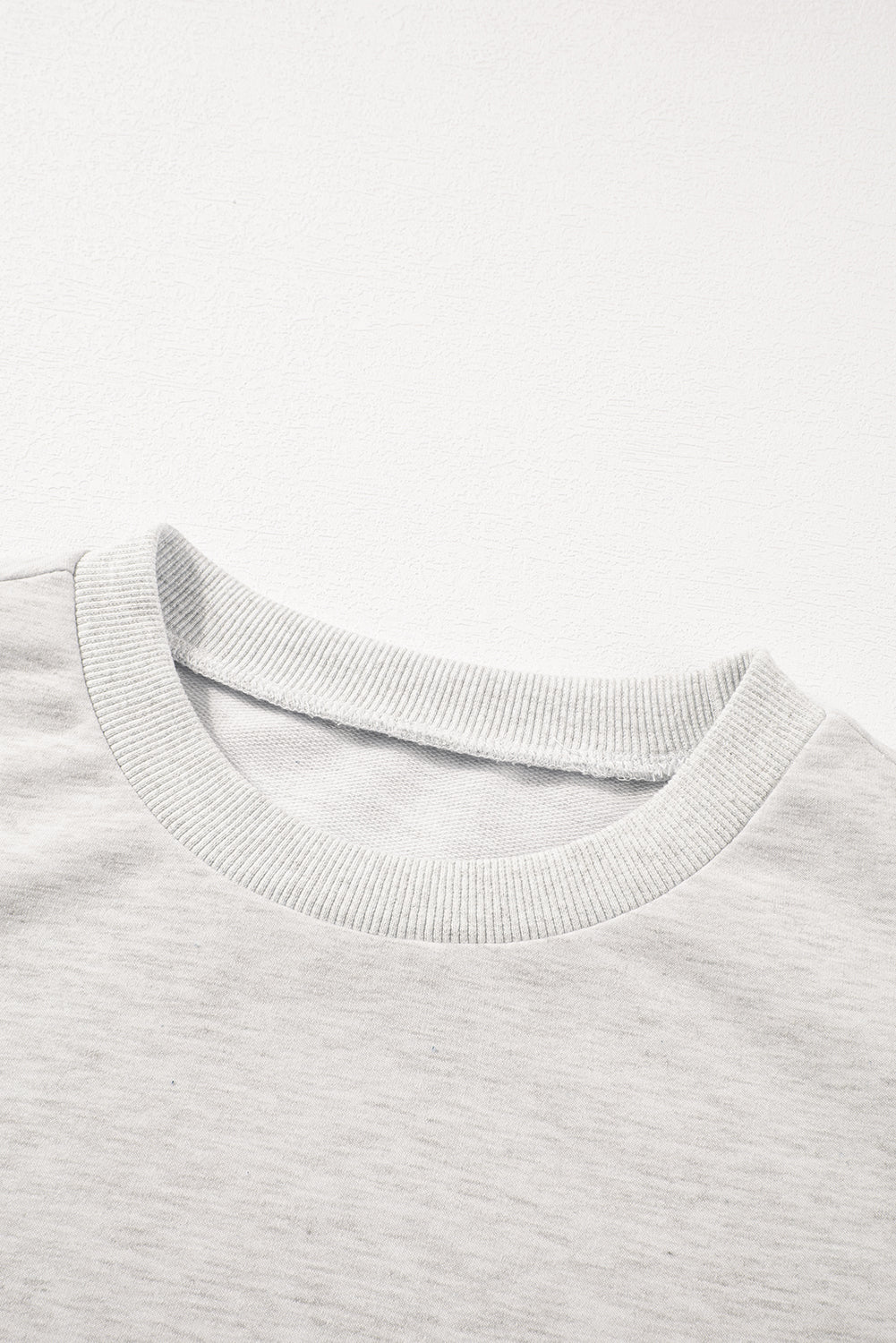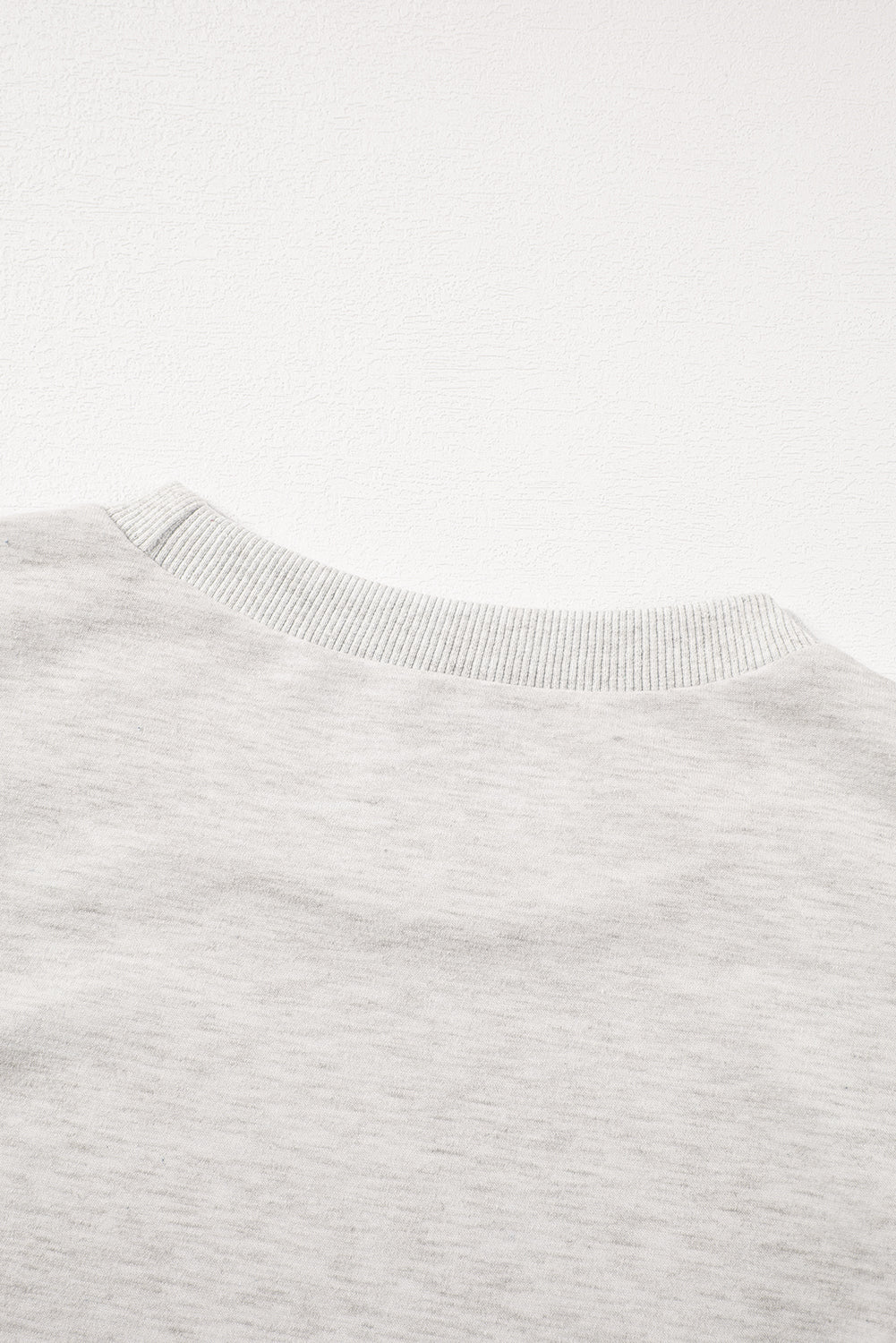 This light grey crew neck top features stylish half puff sleeves adorned with shimmering rhinestones and elegant pearls, creating a sophisticated and eye-catching look. Crafted from high-quality knit fabric, it offers both comfort and style, making it perfect for any occasion where you want to shine with grace and confidence.